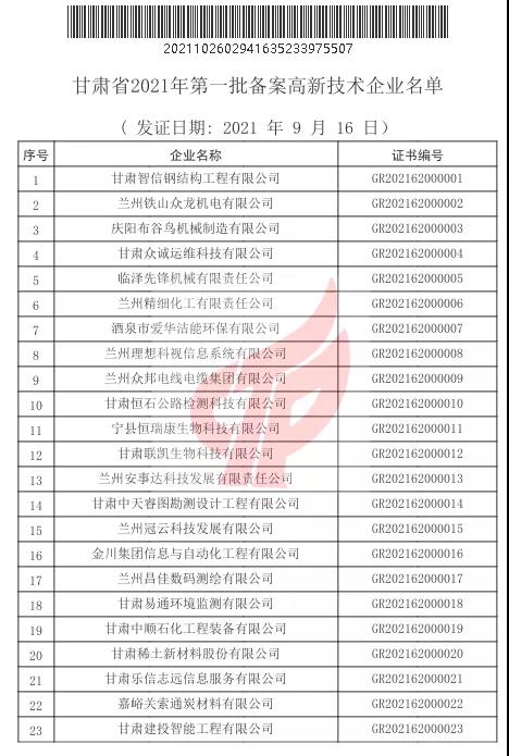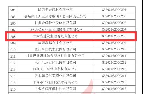 根據(jù)《高新技術企業(yè)認定管理辦法》和《高新技術企業(yè)認定管理工作指引》有關規(guī)定,全國高新技術企業(yè)認定管理工作領導小組辦公室于10月26日正式公布了甘肅省2021年第一批備案的294家高新技術企業(yè)名單,建設監(jiān)理公司榜上有名,被評定為“高新技術企業(yè)”