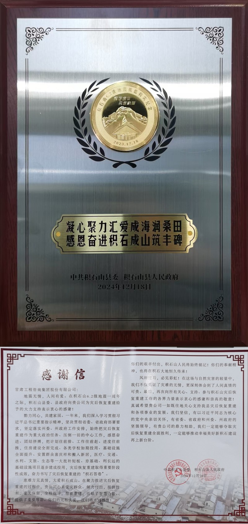 1月22日,時值北方農(nóng)歷小年。中共積石山縣委、積石山縣人民政府為甘肅工程咨詢集團送來感謝信,對甘肅工程咨詢集團在災(zāi)后恢復(fù)重建給予的大力支持表示感謝,并致以節(jié)日問候。