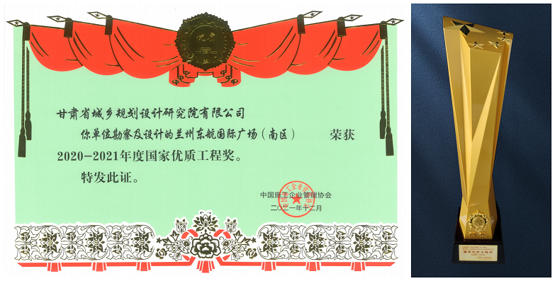甘肅省城鄉(xiāng)規(guī)劃設(shè)計研究院勘察、設(shè)計的“蘭州東航國際廣場(南區(qū))項目”榮獲“2020—2021年度國家優(yōu)質(zhì)工程獎”。此前,該項目已榮獲2020年工程建設(shè)項目綠色建造設(shè)計水平評價三等成果、2020年度甘肅省優(yōu)秀工程勘察設(shè)計三等獎等多項榮譽(yù)。
