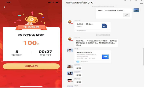 豐富載體,營造濃厚學習氛圍。各基層黨支部通過開展“三會一課”,轉發(fā)主流媒體報道,分享學習輔導資料,線上線下引導黨員通過積極參與集體學習、線上答題、視頻學習等形式,拓寬學習渠道,豐富學習載體,全方位、深層次、多途徑開展黨的二十大精神學習宣傳工作,多措并舉營造學習黨的二十大精神的濃厚氛圍。