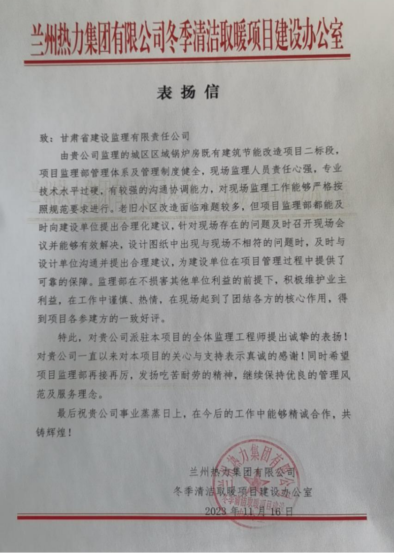 近日,省建設(shè)監(jiān)理公司收到蘭州熱力集團(tuán)有限公司冬季清潔取暖項(xiàng)目建設(shè)辦公室發(fā)來(lái)的表?yè)P(yáng)信,對(duì)省建設(shè)監(jiān)理公司城區(qū)區(qū)域鍋爐房既有建筑節(jié)能改造項(xiàng)目二標(biāo)段監(jiān)理部全體人員表示感謝。