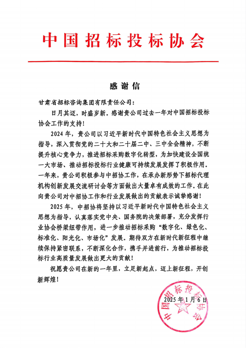 近日,省招標(biāo)集團(tuán)收到來(lái)自中國(guó)招標(biāo)投標(biāo)協(xié)會(huì)(下稱“中招協(xié)”)的感謝信,感謝省招標(biāo)集團(tuán)作為中招協(xié)常務(wù)理事單位為招標(biāo)投標(biāo)行業(yè)發(fā)展作出的積極貢獻(xiàn)。